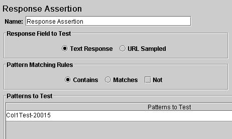 您可以在该屏幕中添加文本断言。单击 Add ,然后在 Patterns to Test 字段中添加文本 Col1Test-20015 ,因为我们知道在返回结果中应当包含该文本(参见 图 11)。