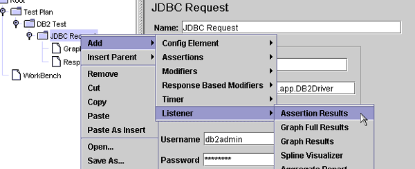 现在,我们要添加一个监听器,以监听响应断言。右击 JDBC Request,然后选择 Add => Listener => Assertion Results,如 图 12所示。