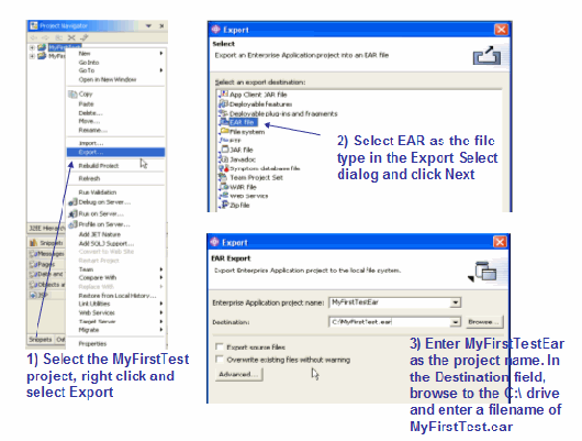 在 Web 透视图中,按照图 17 中所示的步骤来将 MyFirstTest 企业应用程序导出到 EAR 文件中。