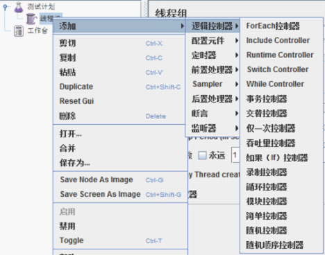逻辑控制器,包括两类无件,一类是用于控制test plan 中 sampler 节点发送请求的逻辑顺序的控制器,常用的有 如果(If)控制器、switch Controller 、Runtime Controller、循环控制器等。另一类是用来组织可控制 sampler 来节点的,如 事务控制器、吞吐量控制器。
