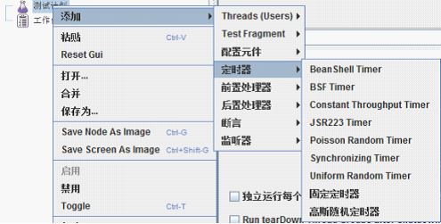定时器(Timer)用于操作之间设置等待时间,等待时间是性能测试中常用的控制客户端QPS的手端。类似于LoadRunner里面的“思考时间”。JMeter 定义了Bean Shell Timer、Constant Throughput Timer、固定定时器等不同类型的Timer。