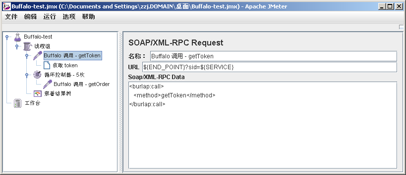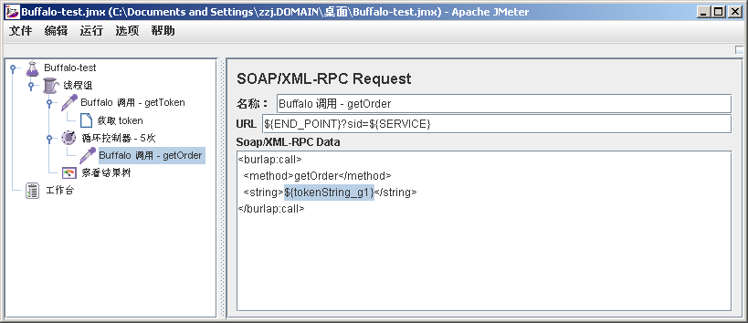 可以使用 JMeter 提供的 后置处理器(Post Processers) --> 正则表达式提取器 (Regular Expression Extractor) 从返回的结果中取得数据, 在确定 getToken() 请求的返回值是类似下列的 XML 之后,