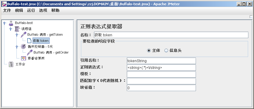 这样使用"正则表达式提取器"(如下图), 注意图中的"引用名称"可以认为是存放提取出来的数据的变量名: