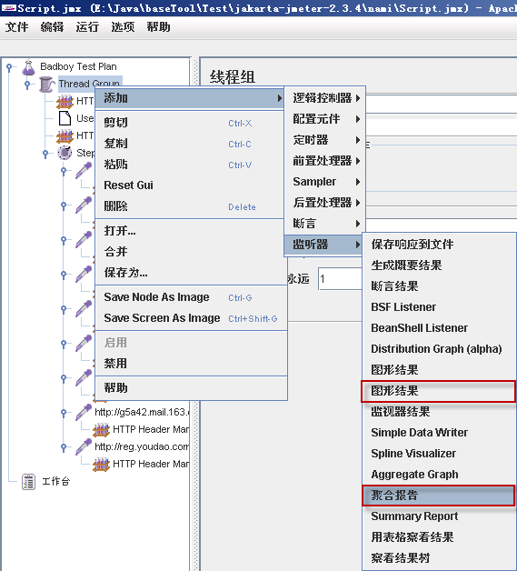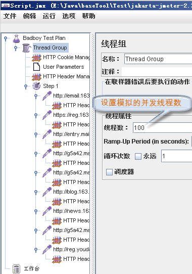 2.2 测试并发 (1)运行Apache Jmeter,文件à打开 ,然后选择刚才保存的录制文件 Script.jmx (2)设置模拟并发的线程数量