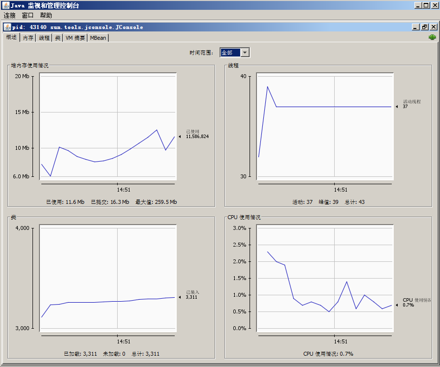 和JMeter一起使用的可能是JDK自带的测试工具JConsole,位于JDKinJConsole,此工具主要观察堆、JVM、CPU的使用情况,界面如下: