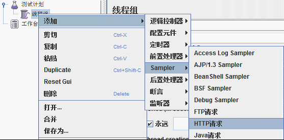 添加完成线程组后,在线程组上右键菜单(添加--->Sampler--->HTTP请求)选择HTTP请求。对于jmeter来说,取样器(Sampler)是与服务器进行交互的单元。一个取样器通常进行三部分的工作: