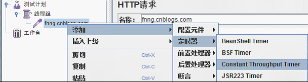 右键点击fnng.cnblogs.com ,弹出菜单(添加--->定时器--->Constant Throughput Timer)选择Constant Throughput Timer