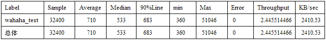 测试结果分析:总共应该有36000个样本,只显示32400个样本,那是因为有3600个样本,在该测试时间范围内在另外一台笔记本上进行了测试(笔记本测试得出3600个线程可以正常显示页面)。测试结果显示36000个线程显示页面的平均时间不到1秒,小的为0.4秒,大为51秒,90%都可在不到1秒内显示页面,流量还是有点大2.4M/秒。