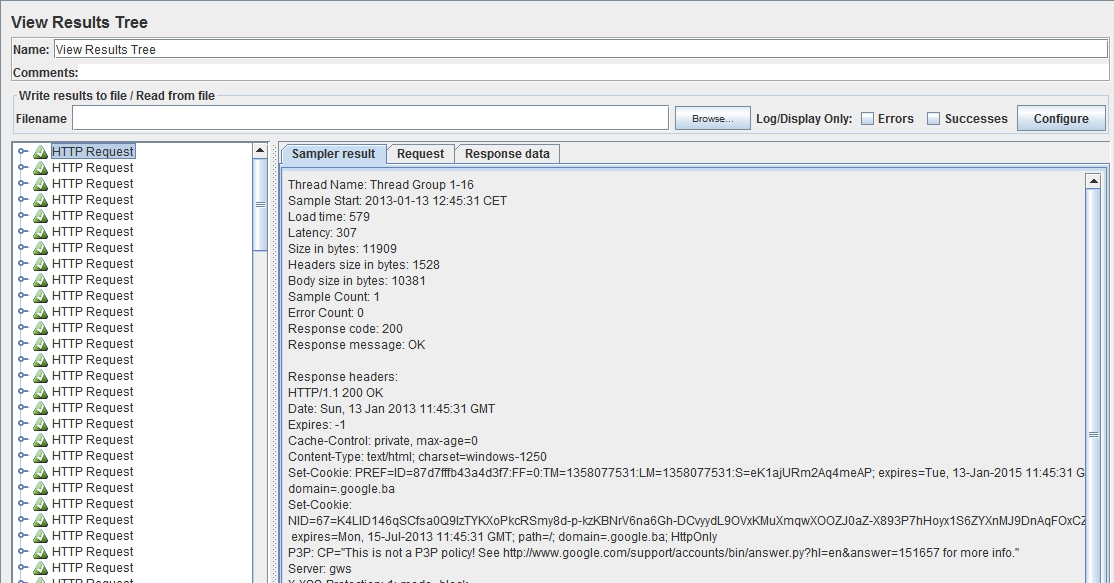 你的全部的请求响应结果都将会显示在这里。按:Ctrl + R 开始运行这个测试。如果打开结果视图窗口(View Results Tree),你可以看到实时的运行状态。运行完后,你可以再按: Ctrl + E 来清除旧的结果,并重新按 Ctrl + R 来重新启动一次新的测试。后,你可以看到类似以下的结果:
