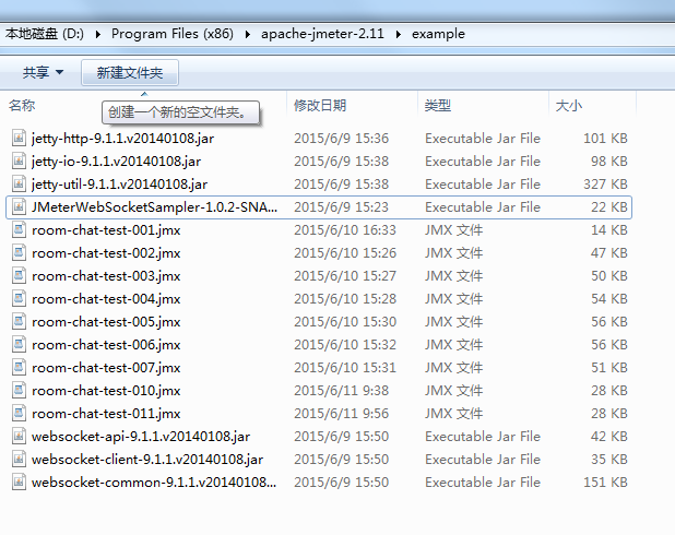 测试工具我使用的是JMeter,版本为2.11。这个是同事拷贝给我的绿色版本。只要有Java环境可以运行(下载地址:apache-jmeter-2.11)。点击bin目录下的jmeter.bat可以运行了。我这个版本本身是不支持websocket测试的,于是需要下载一个插件叫做JMeterWebSocketSampler-1.0.2-SNAPSHOT.jar,这个插件需要下载6个依赖包,如下图所示: