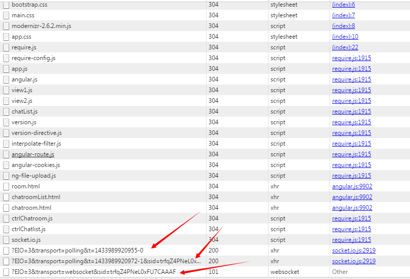 在插件安装好了后,可以使用jmeter来模拟socket.io的通信了。首先打开chrome控制台,查看network。进入含有socket.io的页面时,我们可以看到如下图所示的几个链接。