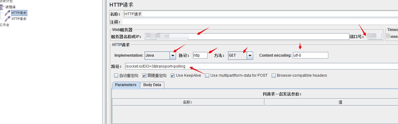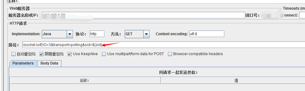 我们只需要把这几个链接用jmeter实现了,可以模拟浏览器和服务器的通信了。首先我们模拟前两个请求。点击请求我们可以看到这个请求的详细信息,从header上我们可以发现其实这两个请求还是HTTP请求,只不过带的参数不一样。第二个请求比第一个请求多带一个参数叫sid,他的值是第一个请求所相应的。这两个请求我们可以看做是TCP中的1次握手过程(我不懂TCP的三次握手,感觉这个应该和它差不多)或者说是一次认证,这个sid是通信的标识。下面我要使用jmeter模拟这两个请求。在线程组的sampler里面选择HTTP请求。如下图所示: