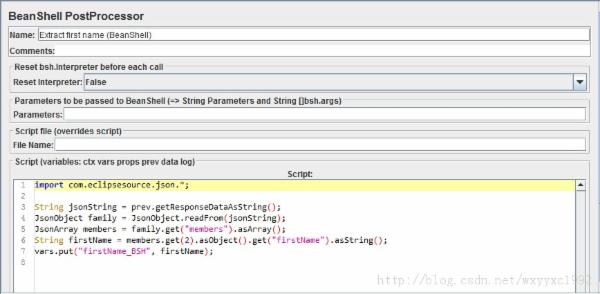 后一种方法即是借用了 JMeter 的对于 BeanShell 支持的特性, BeanShell 是一个轻量级的面向 Java 的脚本语言。 BeanShell Post Processor 允许使用标准的 Java 语法来处理 Json 数据,使用方法如下图所示: