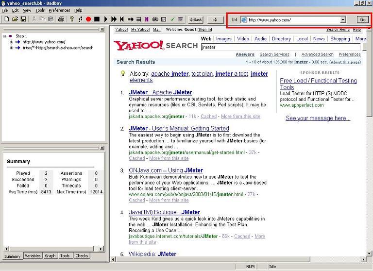 4.开始录制后,你可以直接在Badboy内嵌的浏览器(主界面的右侧)中对被测应用进行操作,所有的操作都会被记录在主界面左侧的编辑窗口中——在这个试验中,我们在Yahoo的搜索引擎中输入 JMeter 进行搜索。不过你将看到,录制下来的脚本并不是一行行的代码,而是一个个Web对象——这有点像LoadRunner的VuGen中的Tree View视图;