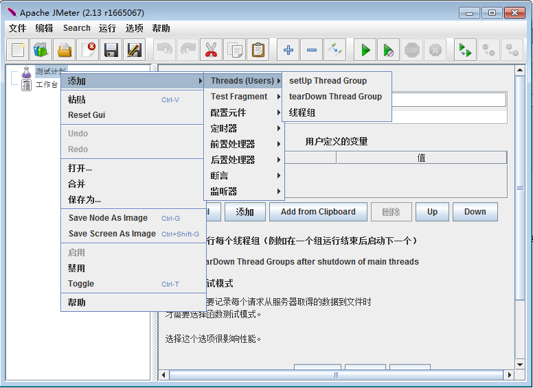 2、添加线程组:在“测试计划”上点击鼠标右键-->添加-->threads(Users)-->线程组,添加测试场景设置组件,接口测试中一般设置为1个“线程数”,根据测试数据的个数设定“循环次数”。