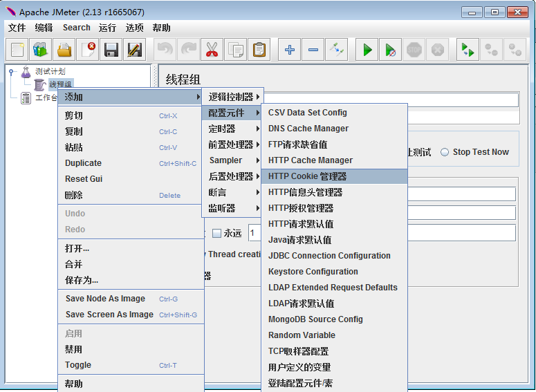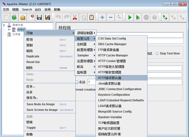 4、添加“Http请求默认值”组件,当被测系统有的访问域名和端口时,这个组件很好用:
