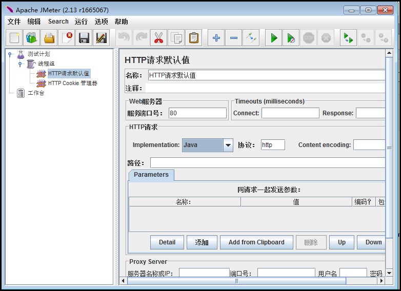 5、在“HTTP 请求默认值”组件配置页面,填写被测系统的域名和端口,http请求的实现包版本以及具体协议类型,线程组里的所有“HTTP Sampler”可默认使用此设置。
