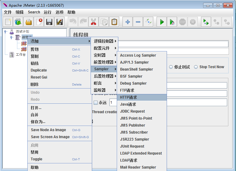 6、在“线程组”里添加“HTTP 请求”的Sampler