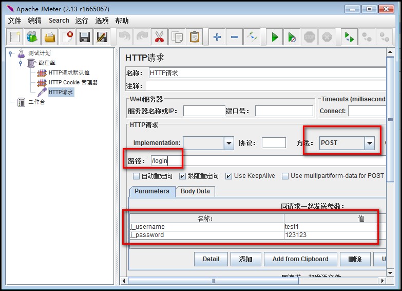 7、在HTTP请求设置页面,录入被测接口的详细信息,包括请求路径,对应的请求方法,以及随请求一起发送的参数列表: