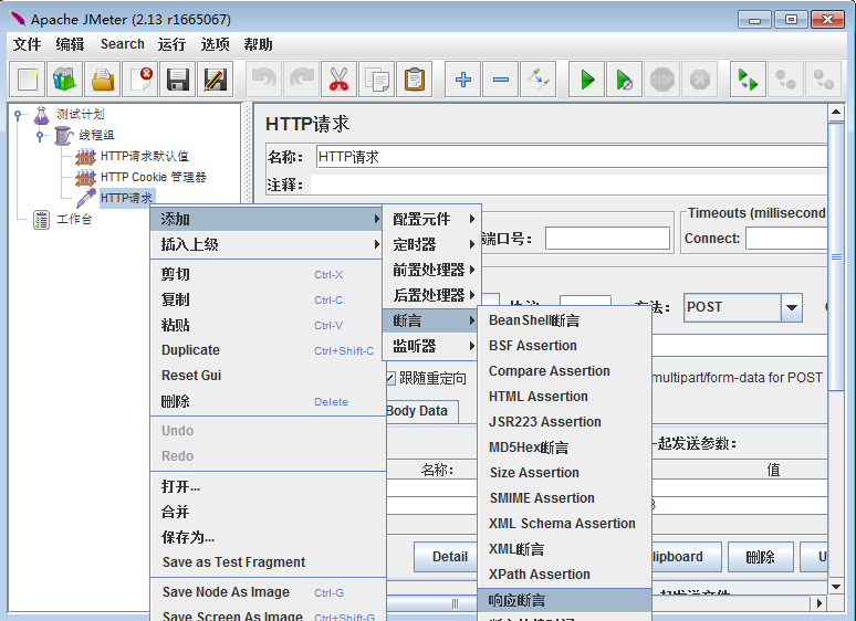 8、设置检查点:在被测接口对应的“HTTP 请求”上,添加“响应断言”