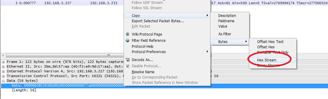 第二步:右键点击Data--->Copy-->Bytes-->HEX Stream,如下图: