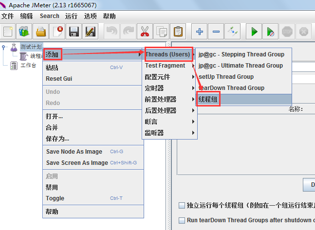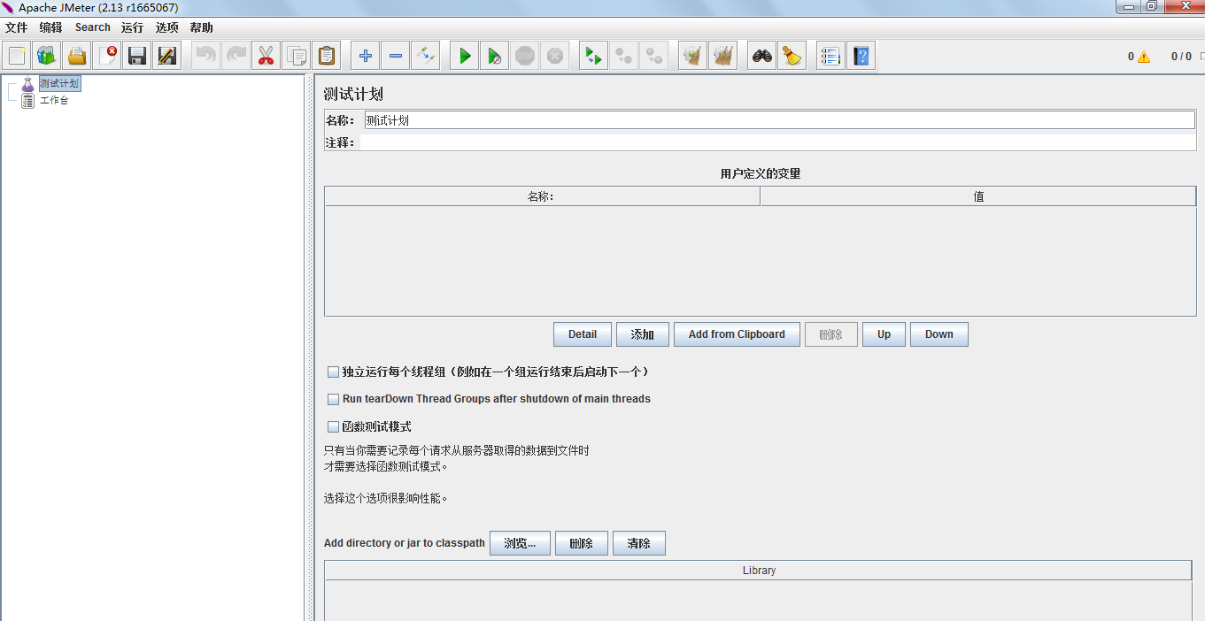 2.点击电脑桌面jmeter快捷方式,进入jmeter界面。界面默认会有一个测试计划和一个工作台,测试计划下默认会有一个线程组。