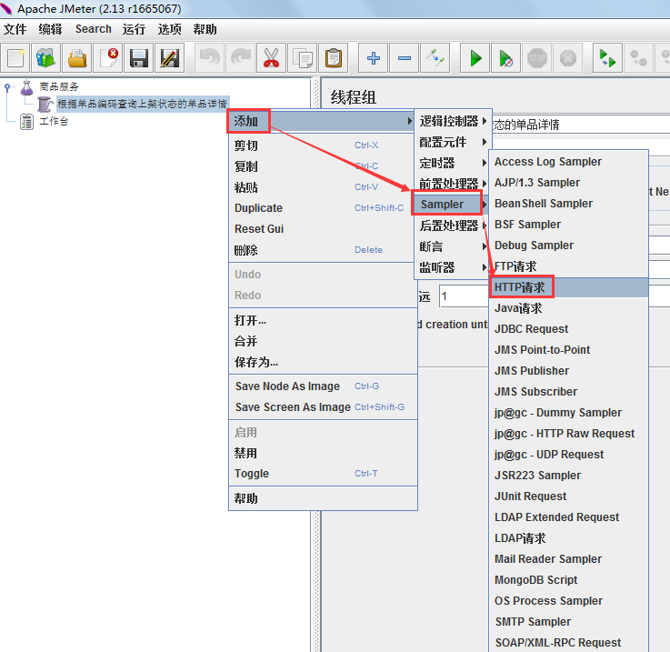 4.在线程组下添加HTTP请求,路径为右击“根据单品编码查询上架状态的单品详情”->添加->Sampler->HTTP请求。