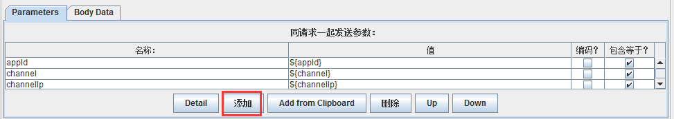5.3在请求参数区域,点击“添加”按钮添加请求参数