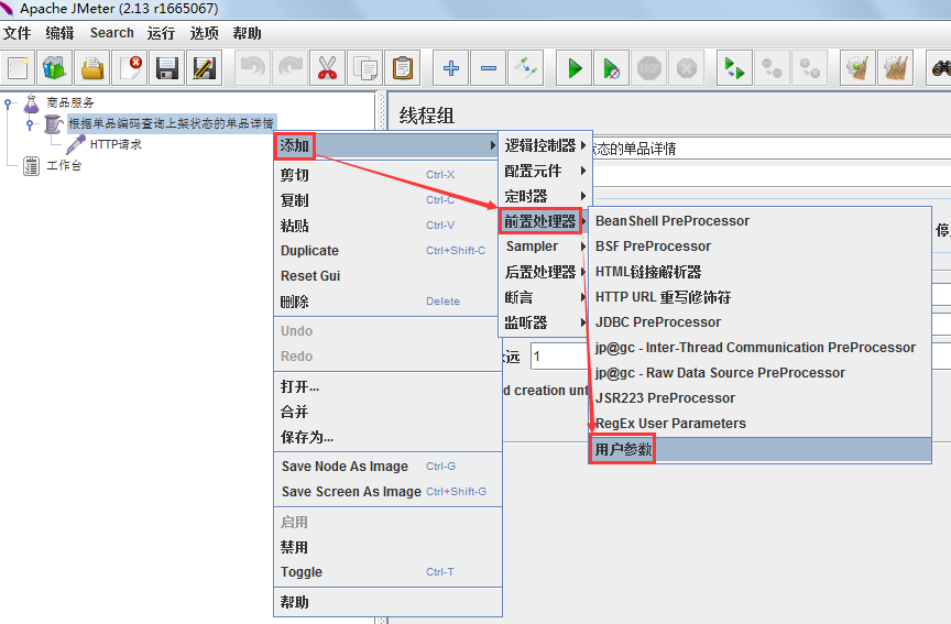 6.在线程组下添加用户参数,路径为右击“根据单品编码查询上架状态的单品详情”->添加->前置处理器->用户参数。