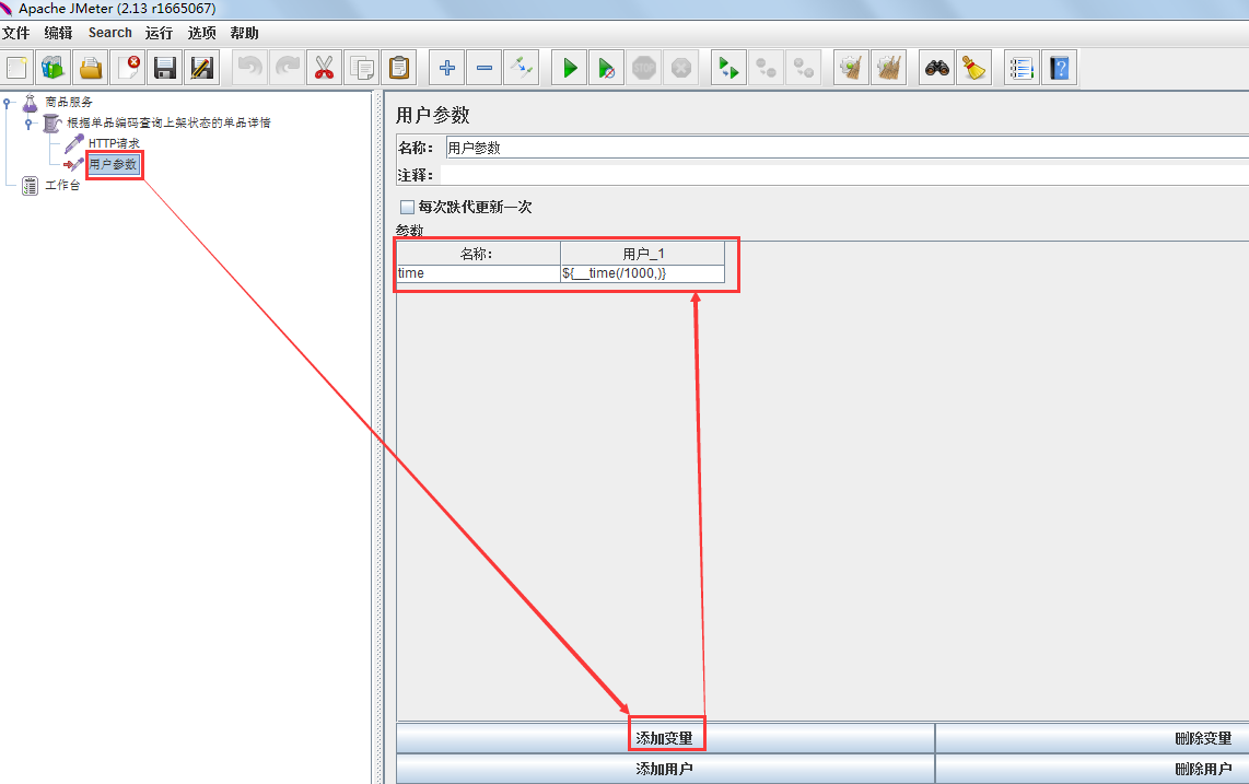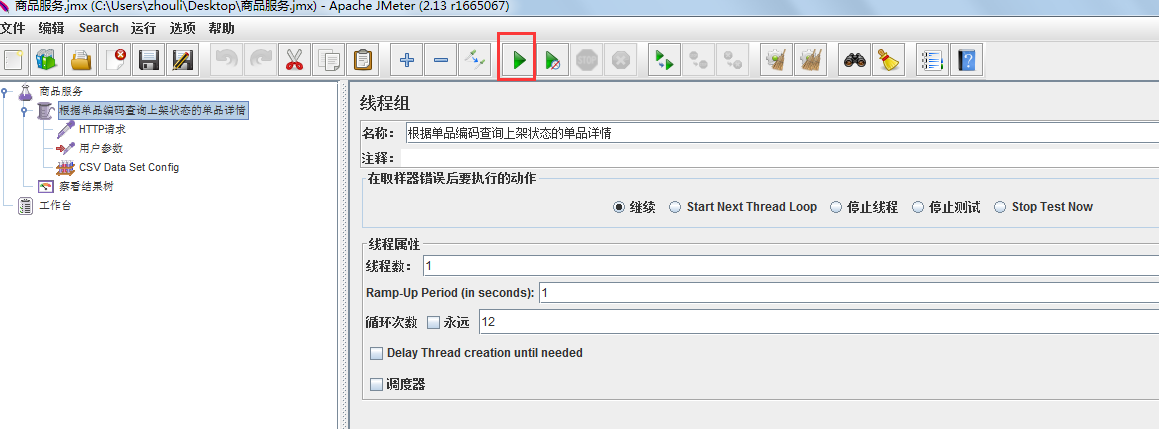 11.getObjectByCode.txt文件中有12条请求参数值,设置循环次数为12,点击“根据单品编码查询上架状态的单品详情”,设置循环次数为12,其它的取默认值。