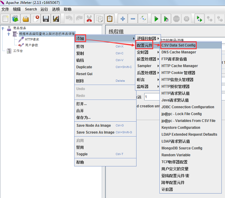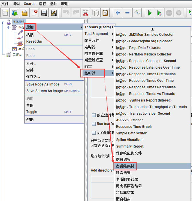 12.添加察看结果树,路径为右击“商品服务”->添加->监听器->察看结果树。