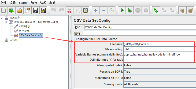 9.在CSV Data Set Config界面填写文件名、编码格式、参数名、分隔符,其它的取默认值。