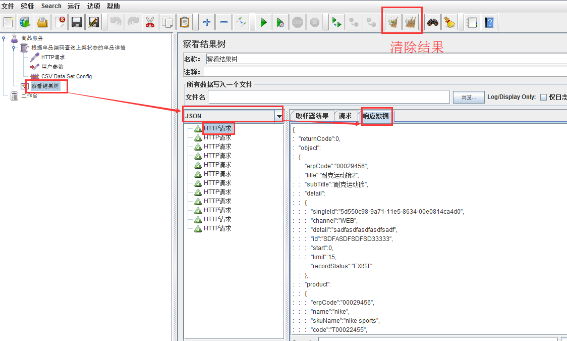 15.点击察看结果树->设置响应数据显示格式为JSON->点击任意一个HTTP请求->点击响应数据,这样可以查看结果。