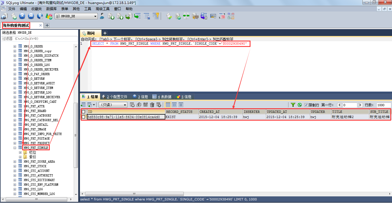对应SQL命令为:SELECT * FROM HWG_PRT_SINGLE WHERE HWG_PRT_SINGLE.`SINGLE_CODE`='S0002938490'