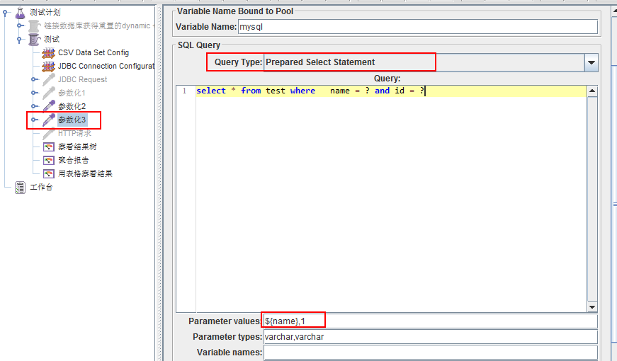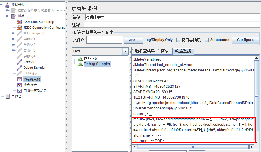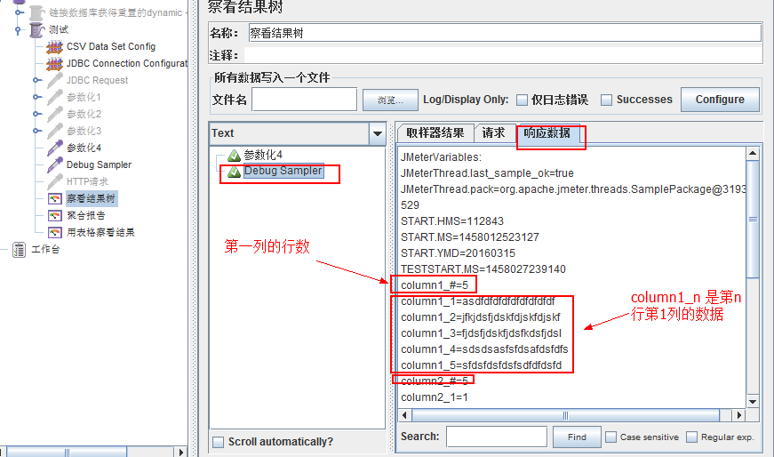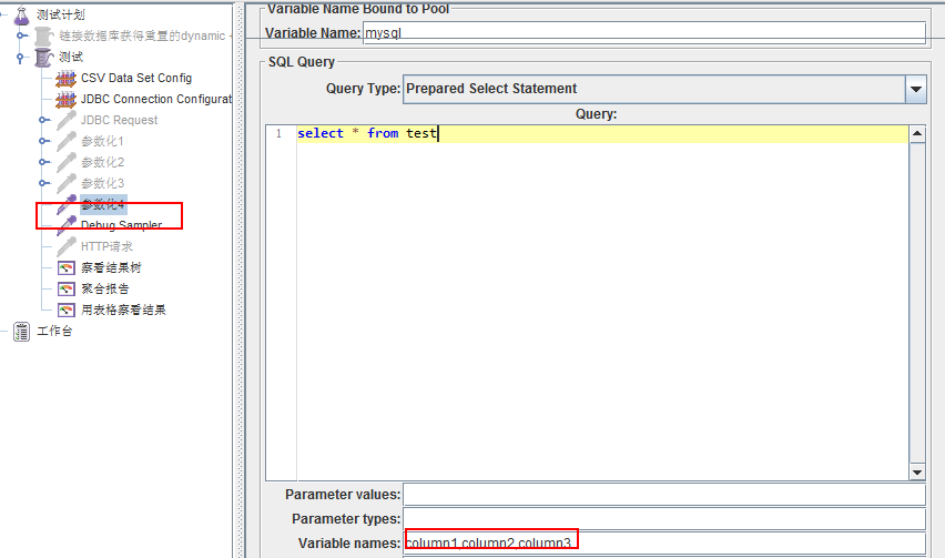 1、添加一个jdbc request名为”参数4“,添加一个”Debug Sampler“用来查看输出的结果,设置 variables name为column1,column2,column3: