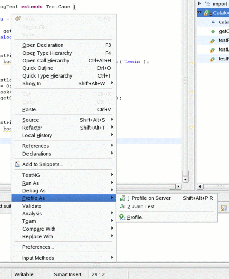 您可以直接从这个窗口运行分析工具,也可以使用位于要分析的测试类上的上下文菜单,方法是选择Profile As菜单项(参见图4)。