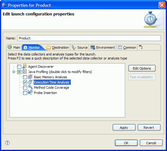 下一步是通过设置性能测试选项作为收集执行信息的方法。设置这些选项,可以点击Launch configuration properties 向导中的Monitor页,选择一组适合的性能选项。提示:一组性能测试过滤器是能够被复用的。设置性能测试过滤器的目的是为了在连续相同的测试中复用,或者是在需要相同的性能测试信息时共享这些过滤器。以下的各个步骤描述了怎样创建一个用于剖析Product catalog的应用的过滤器。我们将创建一个叫ProductFilterSet,用于剖析包名前缀为com.sample.product 的包。