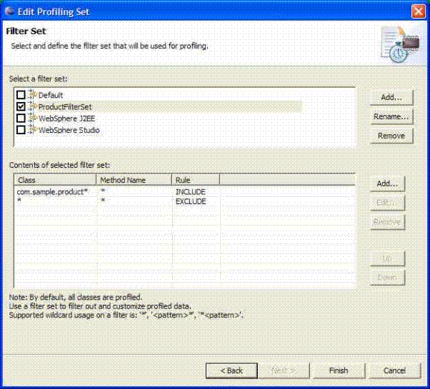 在Moniter页中,选择Java Profiling项,然后双击或者单击编辑按钮,打开The Filter Set 向导。利用The Filter Set 界面来选择你想剖析的类,这里已经预先定义了一组可用的过滤器,本例来说,你可以通过下面几步创建一个新的过滤器: