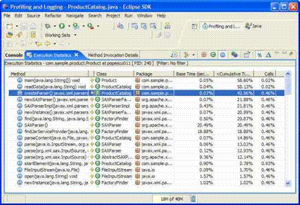 正如上图所示,Execution Statistics 显示在上方的方法:main(java.lang.String[]), readData(java.lang.String) 和createParser() 消耗了多的执行时间。看见main和readData方法在列表中(的位置)是不奇怪的,因为前者是程序执行的开始点,后者从其名字可以看出它从xml文件中读取产品信息。