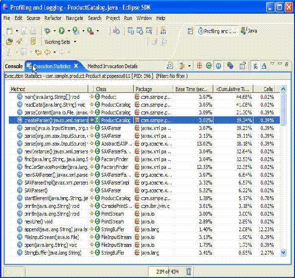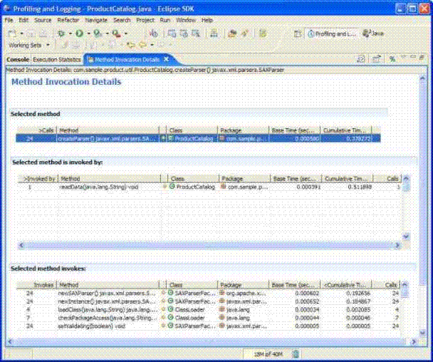 上图中显示了方法createParser()的执行信息,像你看到的一样,该方法被readData(java.lang.String)调用了一次,同时它调用了5个不同的方法,在invoked methods 表中,你能看见newSAXParser() 和newInstance() 方法可能是createParser()方法执行慢的原因,这两个方法跟createParser()被调用24次一样,也被执行了24次。