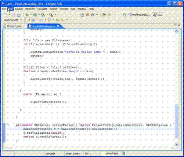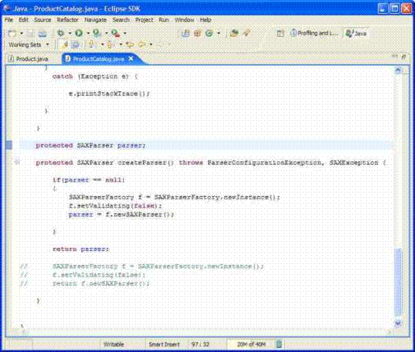 上图中显示了createParser()方法的源代码。注意该方法每次调用都创建一个新的SAX parser 。更新代码,只创建一个parser实例,复用于解析每个xml文件,如下图所示: