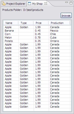 我们有这样一个插件,用来从磁盘上读取记录产品信息的 XML 文件,然后在一个表格中将其显示出来。这整个插件后的表现形式是一个 Eclipse 视图: