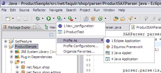 插件安装成功后,可以在工具栏上看到以 profile 模式运行的图标。点击该图标并选择以 Eclipse 应用的方式运行该程序。