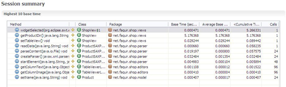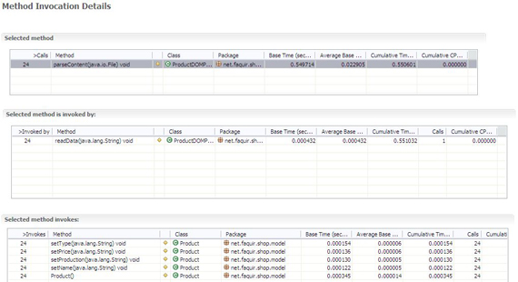我们 MyShop 插件的运行结果如上图所示。可以看到,getProductDir 方法耗时长。而该方法的作用是打开一个文件选择对话框,等待用户的选择,等选择完成后再关闭对话框。因此其时中包含了等待用户选择的部分。这当然应该在 我们的性能分析中排除在外。除此之外耗费时间长的是 parseContent 方法。该方法用于从包含产品信息的 XML 文件中获取真正的产品信息数据。双击该方法查看该方法调用的详细数据。
