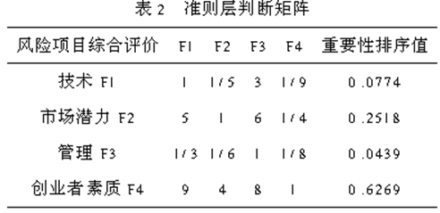 对于所选定的备选项目的评价指标,根据上述内容可以分析出各评价指标的重要程度,两两比较得到的判断矩阵(表)如表2所示。