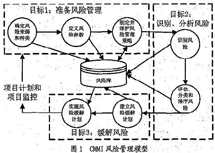 5. CMU/SEI的CMMI(Capability Maturity Model Integration)风险管理过程:CMMI是由SEI在CMM基础上发展而来。目前,CMMI是全球软件业界的管理标准。风险管理过程域在CMMI的第三级,即已定义级中建立一个关键过程域(KPA,Key Practice Area)。CMMI认为风险管理是一种连续的前瞻性的过程。它要识别潜在的可能危及关键目标的因素,以便策划应对风险的活动和在必要时实施这些活动,缓解不利的影响终实现组织的目标。CMMI的风险管理被清晰地描述为实现三个目标,每个目标的实现又通过一系列的活动来完成,如图1示。