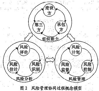 在风险管理的基本过程中,协同过程模型与现有模型是一致的,分识别、估计、分析、计划、控制和监督六步,但是,协同模型与现有模型的一个重要区别在地强调建设方,承包方和第三方的介入。其模型如图2所示。