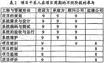 被访问项目在整个软件项目的风险管理过程中,项目的参与者包括建设方、开发承包商,实施顾问公司,管理顾问公司,监理公司。项目的全流程和各个项目参与者在项目的生命周期如表5所示。在这九个项目中全部为外包项目,其中有九个项目有八个引入了项目顾问,八个项目进行了项目监理,如表2所示。