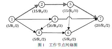 R1系统设计人员,R2程序开发人员,R3数据库开发人员,R4系统测试人员。工作节点网络图见图1。其中工作时间a是考虑到不确定因素的非理想工作条件下的工作执行时间。图中粗线标识的路线是时间关键路径。