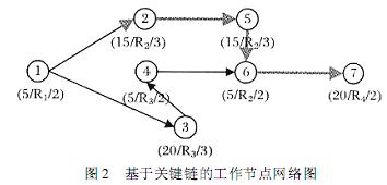 由于考虑到人力资源约束,从图1中可以看出,工作3和工作4资源冲突,工作2、5和工作6也存在资源冲突,我们将它们之间的并行执行关系转化为串行执行,如图1中虚线所示。同时重新按理想工作条件估计每项工作的执行时间,从而得到图2。图2中的工作时间是理想工作时间,粗线标识的是考虑了人力资源约束之后的项目关键链。